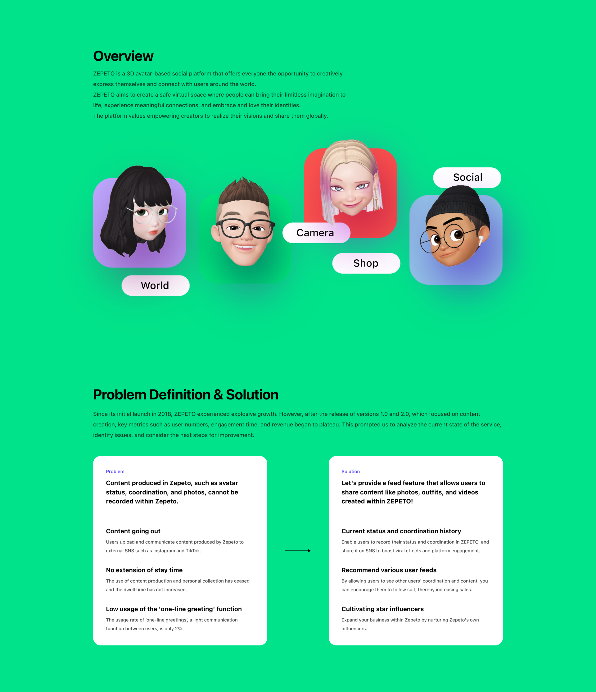 제페토는 누구나 창의적으로 자신을 표현하고 전 세계 사용자들과 소통할 수 있는 3D 아바타 기반 소셜 플랫폼입니다. 2018년 첫 출시 이후 빠르게 성장한 제페토는 1.0과 2.0 버전 출시 후 2019년에 피드(Feed) 기능을 MVP로 출시하고, 이후 제품 전반의 지속적인 기능 개선 작업을 진행했습니다.